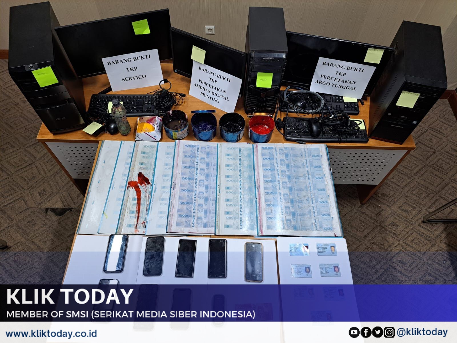 Jakarta, KLIKTODAY.CO.ID — Bareskrim Polri melakukan penggerebekan sebuah rumah produksi uang palsu di dua lokasi wilayah Bekasi, Jawa Barat (Jabar). Penggerebekan itu pun berujung penangkapan 8 tersangka, yakni SUR, SU, IL, AS, MFA, EM, SUD, dan JR.