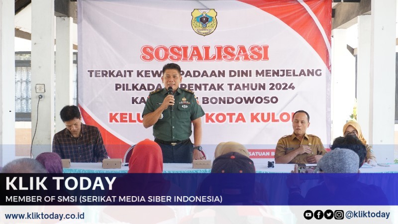 BONDOWOSO, KLIKTODAY.CO.ID – Selasa (29/10) — Dalam rangka sosialisasi Pemilihan Umum Kepala Daerah (Pemilukada) Damai tahun 2024, Bakesbangpol Kabupaten Bondowoso mengadakan kegiatan di Kantor Kelurahan Kota Kulon. Mayor Inf Tanuri, Kasdim 0822 Bondowoso, hadir sebagai pengisi materi, menyampaikan pentingnya kewaspadaan dini serta persiapan menghadapi tahun politik ini dengan sikap bijaksana dan menjaga persatuan.
