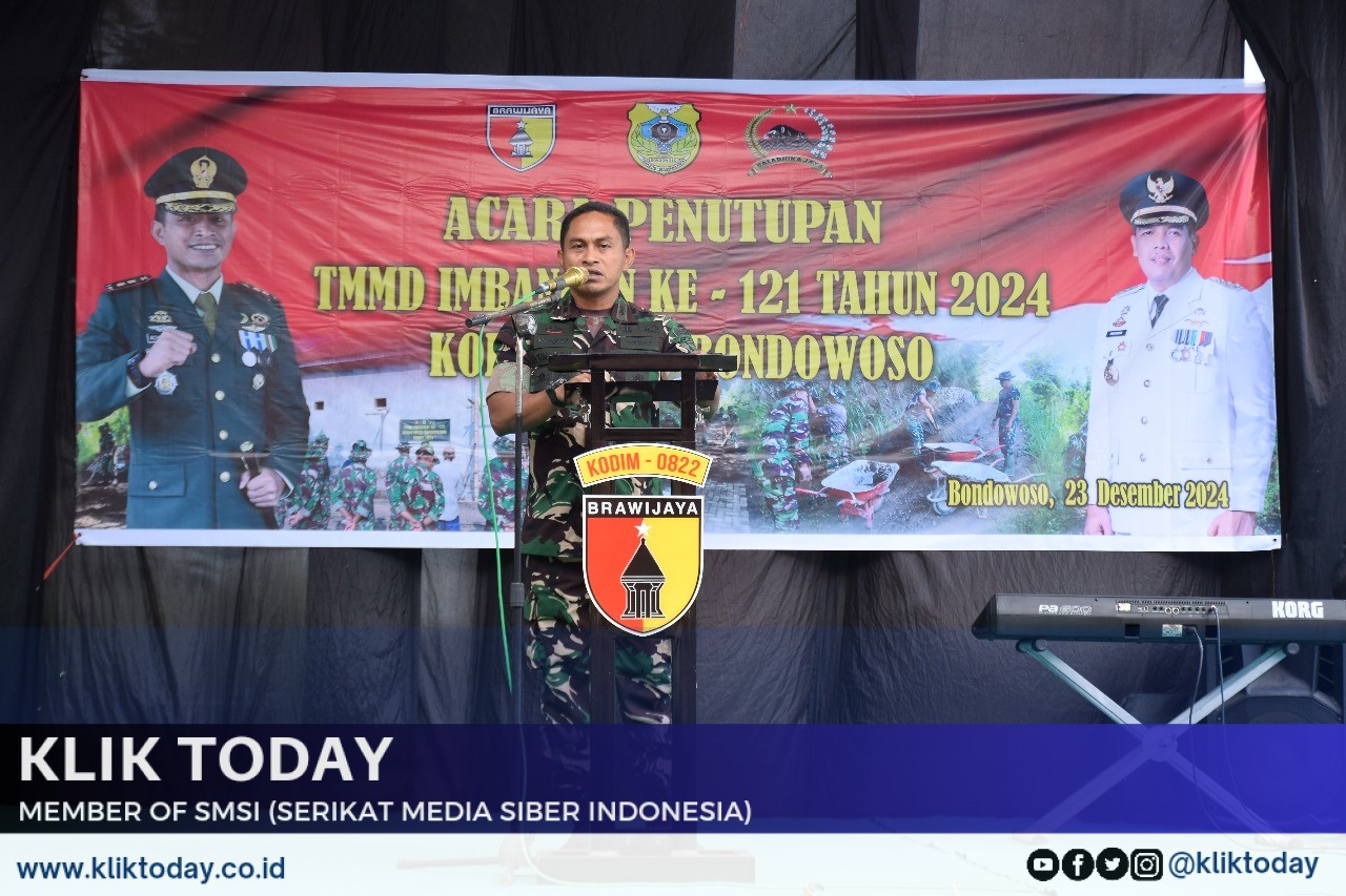 Bondowoso, KLIKTODAY.CO.ID – Kegiatan Penutupan TNI Manunggal Membangun Desa (TMMD) Imbangan Ke-121 Kodim 0822 Bondowoso Tahun 2024 berlangsung meriah di Balai Desa Gubrih, Kecamatan Wringin, Kabupaten Bondowoso, pada Senin pagi. Kegiatan yang dihadiri oleh sekitar 250 orang ini sukses dilaksanakan mulai pukul 08.00 WIB hingga 12.00 WIB. Acara penutupan ini dipimpin oleh Pasi Ter Kodim 0822, Kapten Arm Yonaidi Desianto, dengan dihadiri oleh berbagai pejabat daerah, instansi terkait, serta masyarakat setempat. Senin(23/12)