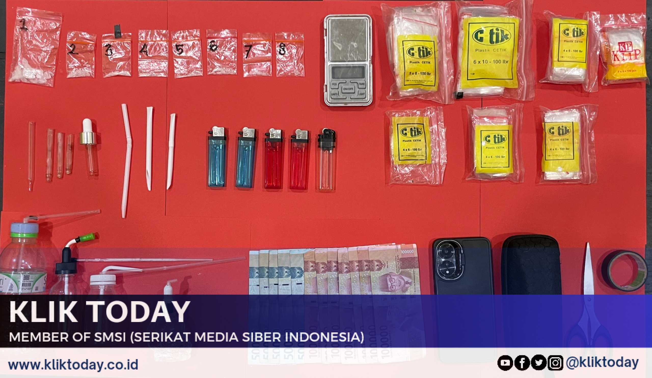 Dari tangannya polisi berhasil mengamankan sejumlah barang bukti diantaranya sabu – sabu seberat 6 gram, uang tunai 950 Ribu Rupiah, 1 buah handphone, 4 buah alat bong, korek api dan sejumlah barang bukti lainnya.