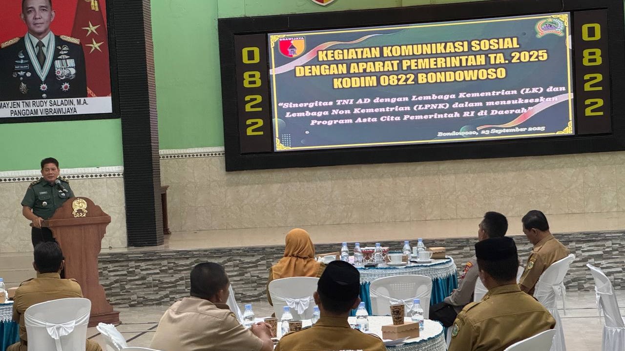 Bondowoso, KLIKTODAY.CO.ID – Suasana hangat dan penuh kebersamaan terasa di Aula Makodim 0822 Bondowoso. Dengan menggelar kegiatan Komunikasi Sosial (Komsos) dengan Aparat Pemerintah Tahun Anggaran 2025 yang dibuka langsung oleh Dandim 0822 Bondowoso, diwakili oleh Kasdim Mayor Inf Tanuri.