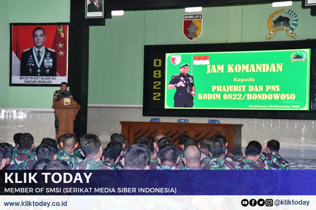 Bondowoso, KLIKTODAY.CO.ID – Dalam upaya memastikan TNI tetap berada pada jalur Netralitas selama Pemilihan Kepala Daerah (Pilkada) 2024, Komandan Kodim 0822/Bondowoso yang diwakili oleh Kasdim Mayor Inf Tanuri memberikan penekanan kepada seluruh prajurit dan PNS Kodim 0822 pada acara Jam Komandan yang dilaksanakan pada Jumat, 8 November 2024. Kegiatan ini bertujuan untuk mengingatkan pentingnya peran TNI dalam menjaga keamanan dan kelancaran Pilkada, dengan tetap mengedepankan Netralitas politik.